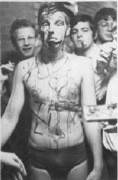 Aanleiding voor dit 'tribunaal' was een inbreuk op de gedragscode dat iemand van flat B geen laatstejaars door Willem liet oproepen. Gevolg was een oproep voor een volksgericht in flat C. Net horizontaal ingestroomd, liet ik me informeren. Uit een ver verleden werd de 'vliegshow' nog opgediept (hockeystick in je pyjamajasje over de schouders in de mouwen, waarna je broek werd gelicht en reflexen werden gemeten bij het vertonen van foto's uit [toentertijd] de Lach). Niet verschijnen leek geen optie en het leek me geraden low profile en dressed up heen te gaan. Dus meerdere zwembroeken wat korte broeken en een trainingsbroek eroverheen moesten in elk geval bijdragen aan een zekere vertraagde uitvoering mocht de vliegshow op het programma staan. Het tribunaal vergde wat improvisatie, want aanvankelijk wilde niemand de rol van verdediger op zich nemen. Uiteindelijk bleek de 'klager', toch een maatje van me, daar (te) graag toe bereid. In een pandemonium van elkaar overschreeuwende rechters en tegengestelde instructies spuwende begeleiders, kwam er uiteindelijk overtuigd, maar allerminst overtuigend een schuldig uit. Het verraste me eerlijk gezegd niet. Van de geboden gelegenheid me op mijn kamer te gaan verkleden voor de 'douchebeurt', hoefde ik tot woede van het gehoor geen gebruik te maken. Kennelijk had ik beseft hoe schuldig ik was en was derhalve de strafmaat te mild geweest. Ik zou nog opgeschilderd worden. En zo geschiedde.
