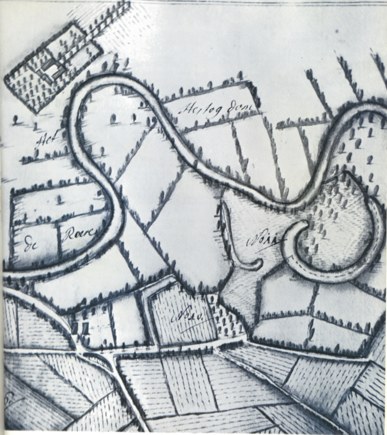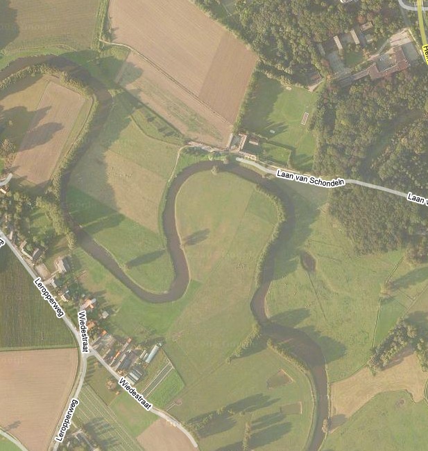 Hoe maatvast de oude kaart is is enigszins gissen. Anderzijds was de kaart goed uit te lijnen op de Leropperweg en de Wiedestraat en een perceelgrens met weg onderaan de kaarten. Het resultaat is onderstaande afbeelding. Je ziet dat de loop van de Roer veranderd is in meer dan 250 jaar tijd, dat is begrijpelijk. Het is denkbaar dat er ergens (forse) schaalfouten in de oude kaart zitten maar alles lijkt redelijk op zijn plaats te vallen.