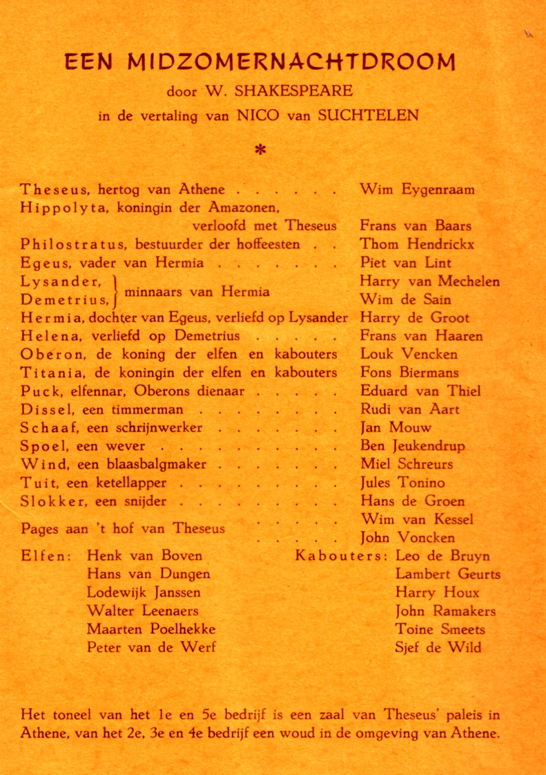 Bij het eeuwfeest in 1951 werd een spetterende opvoering (nou ja, spetterend....) gegeven van de Midsummernightsdream, in een all male cast uiteraard. Bijgaand een scan van de acteurs (uit het programma).